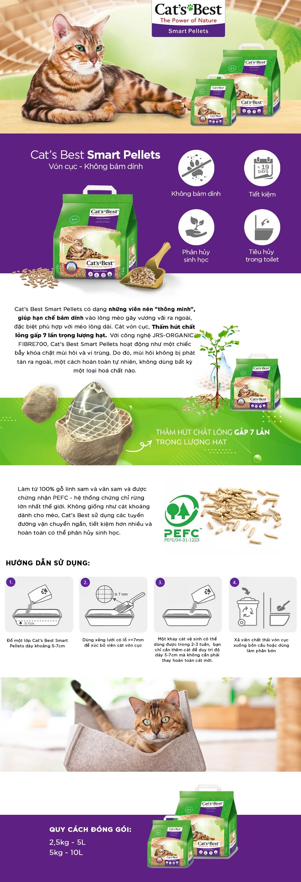 Cat’s Best Original vón cục, thấm hút chất lỏng gấp 7 lần thể tích cát, khóa chặt mùi hôi và vi khuẩn trong một thời gian dài nhờ hệ thống mao dẫn của sợi cây, giải pháp tiết kiệm và an toàn cho cả người, mèo và môi trường.