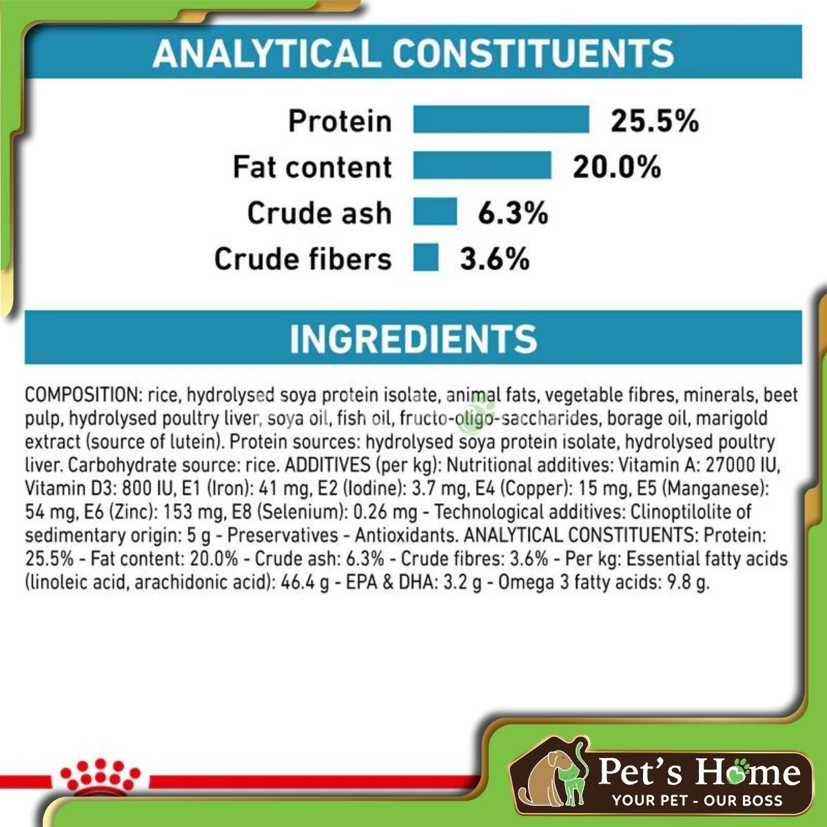 Gạo, protein đậu nành phân lập, chất béo động vật, xơ thực vật, khoáng chất, củ cải đường, gan gia cầm, dầu đậu nành, dầu cá, fructo-oligo-sacarit, dầu lưu ly, chiết xuất cúc vạn thọ (nguồn lutein).