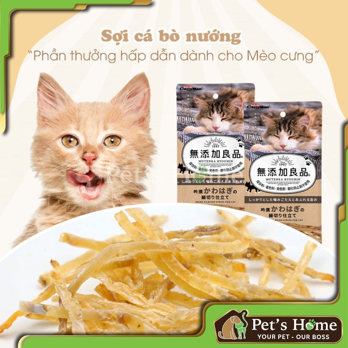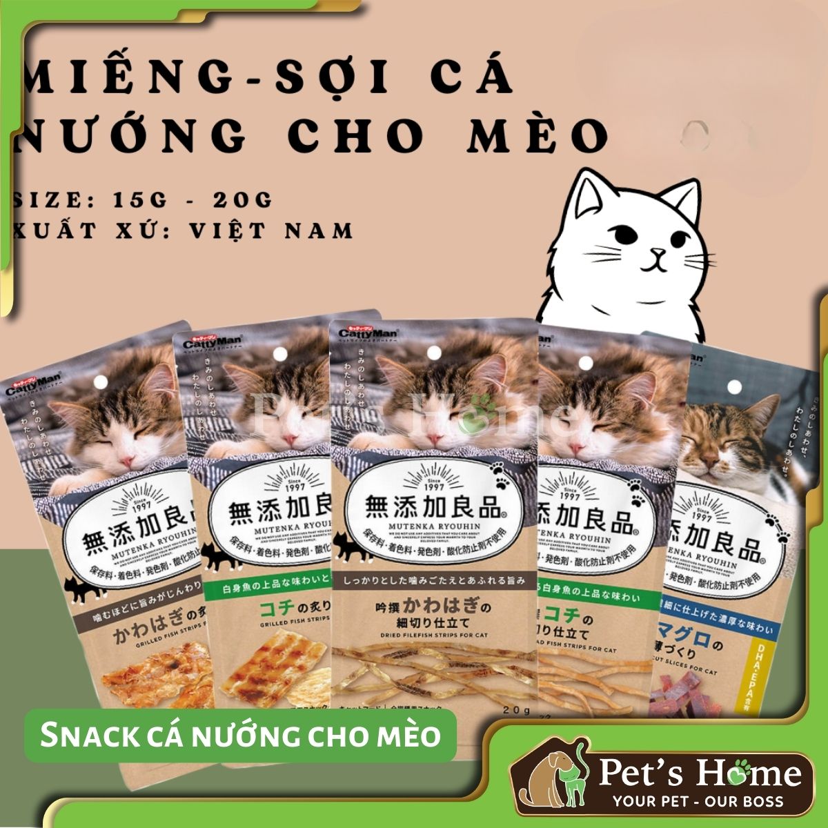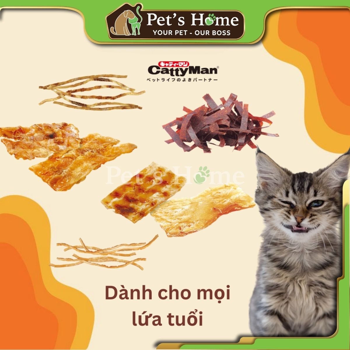 Ngoài súp thưởng thì Pet's Home còn có các loại bánh thưởng khác như loại bánh khô gồm Party Mix, Temptation, Jinny, Gimcat, loại bánh mềm như Ciao Inaba, thịt cá tươi Kit Cat, Toro Toro...