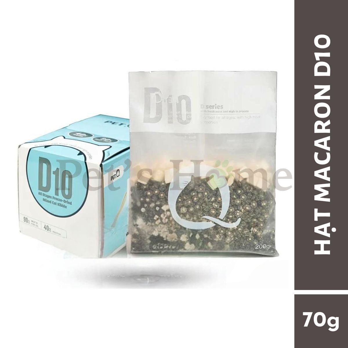 Thức ăn hạt macaron D10 - với hơn 40% protein cùng 90% lượng thịt là dòng sản phẩm mới mà nha PetQ mang đến thị trường với mong muốn cho các bé mèo một món ăn đáp ưng được các tiêu chí: Nguồn đạm cao, bổ sung chất xơ từ rau củ, hạt không muối & ngũ cốc cùng với hương vị hạt thơm ngon không kén ăn. Hạt D10 được sản xuất từ các nguyên liệu bao gồm thịt gà, vịt, cá ngừ, bí ngô, nam việt quất... đặc biệt bổ sung thêm dầu cá hồi, taurine và hơn 10 loại vitamin, D10 sẽ giúp phát triển toàn diện cho mèo về mọi mặt từ xương khớp, cơ bắp, trí não, làn da... "Topping" viên gà sấy đông khô cùng chà bông gà "đầy ắp thịt" liên tưởng đến chiếc bánh macaron thơm ngon, hạt macaron D10 hứa hẹn sẽ Sen và boss hài lòng!